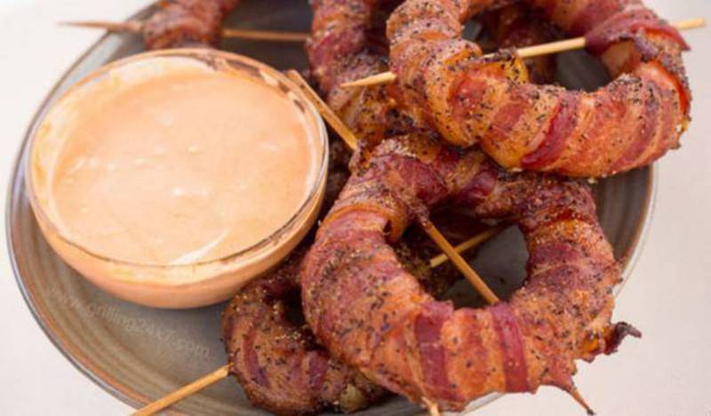 1Receta de aros de cebolla con bacon y salsa