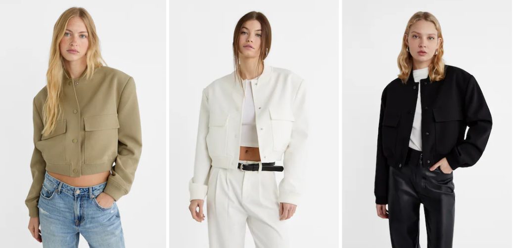 Está confeccionada en poliéster y cuenta con elástico en la cintura, puños y cuello, así como cierre de botones. Además, tiene bolsillos completamente funcionales. Esta prenda es perfecta para la primavera, ya que es ligera y cómoda de llevar. Puedes combinarla con diferentes outfits, desde looks más casuales hasta outfits más elegantes. Incluso, los estilistas de Stradivarius sugieren que la cazadora bomber puede ser una prenda adecuada para mujeres de todas las edades, ya que puede combinar de manera fantástica con faldas y pantalones clásicos, resaltando la cintura de una manera maravillosa.