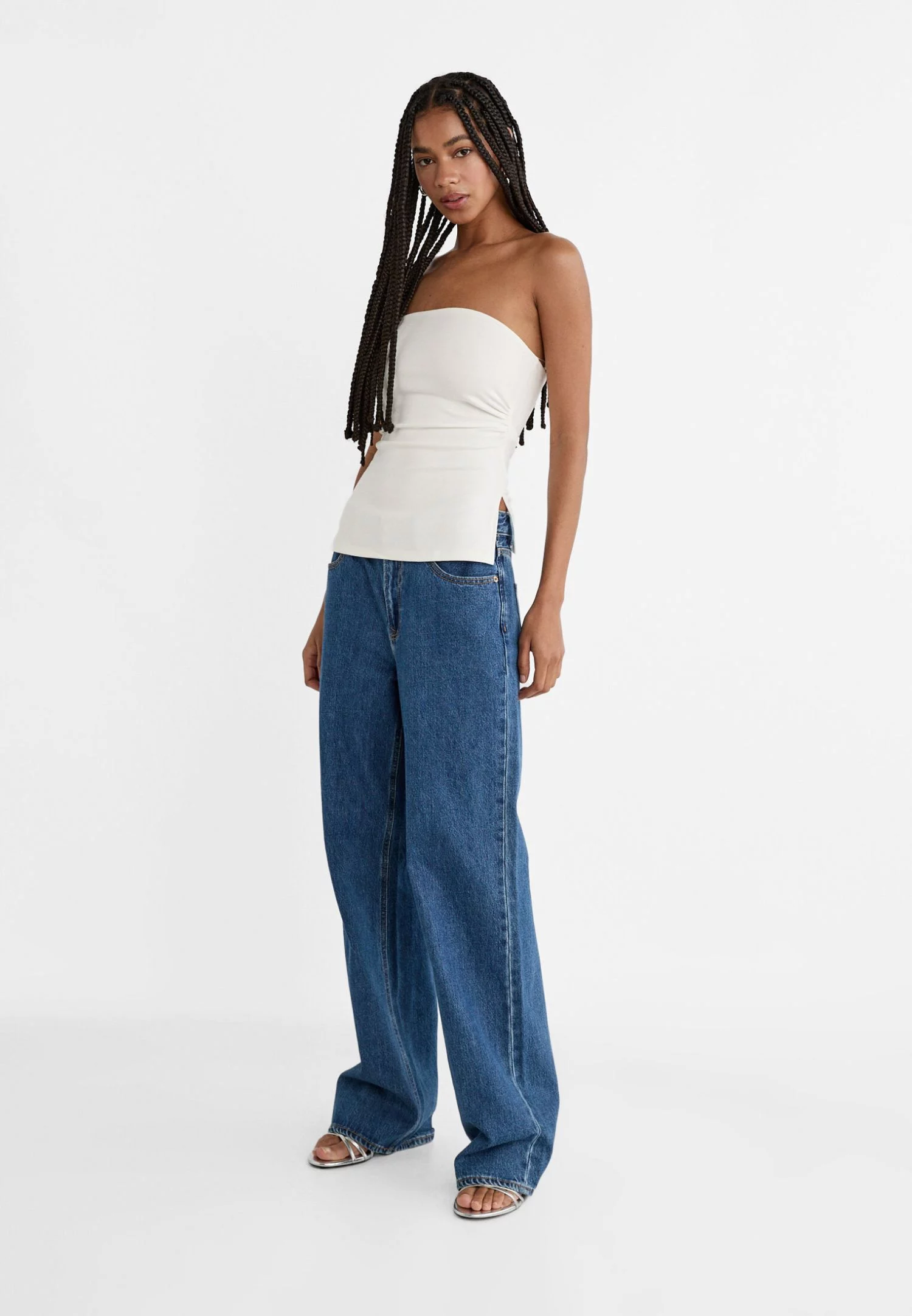 El Top bandeau abertura laterales de Stradivarius es una prenda ideal para crear un look casual y sexy; se trata de un top corto ajustado con escote recto y hombros descubiertos, que tiene dos aberturas laterales a la altura de la cintura.