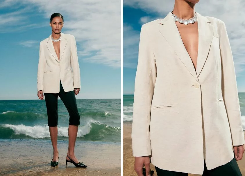 La americana en mezcla de lino de H&M es una elección perfecta, cómoda y fresca para la primavera. El lino es un tejido ligero y transpirable que te mantendrá fresco durante los días cálidos.