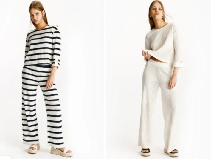 Los pantalones de punto de Lefties son una opción atractiva para aquellos que buscan comodidad, estilo y asequibilidad en sus prendas de vestir, viene en dos colores blanco con líneas azul marino y color natural blanco.