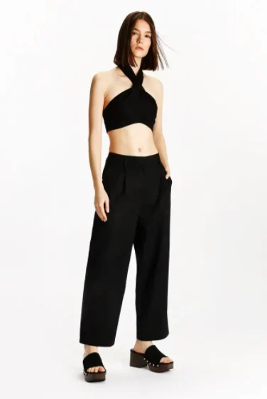 Los pantalones de lino son conocidos por ser prácticos, cómodos y frescos, lo que los convierte en una excelente opción para los días calurosos y este pantalón en color negro que consigues en Lefties, será uno de tus favoritos. Este pantalón es versátil y se puede lucir tanto en eventos formales como informales, y siempre resulta elegante.