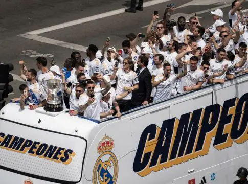 Una vez abandonaron el consistorio, comenzó la verdadera fiesta. Los futbolistas se enfundaron la camiseta del Real Madrid con el dorsal 36, por los títulos ligueros logrados, y la leyenda 'Campeones', y se subieron al autobús descapotable para ofrecer el trofeo a los miles de seguidores madridistas que abarrotaron las calles de la capital española.