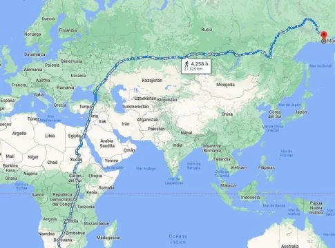 Los puntos exactos son Ciudad del Cabo y Siberia, algo que también denota la lejanía entre ambos, ya que en el país africano hay temperaturas muy altas, mientras que en el europeo pueden descender muy por debajo de los cero grados. Para esto, una persona que se decida a completar la ruta tendría que dedicar unos tres años para completar el viaje, a un ritmo medio de 20 kilómetros al día.