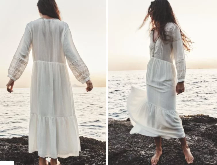 El vestido “Maxi Bordados” de Zara es una pieza distintiva que ha captado la atención de muchos entusiastas de la moda, este vestido presenta bordados en color blanco que decoran parte del escote, el bajo del vestido y el final de las mangas, lo que le confiere un estilo elegante y llamativo; además, está confeccionado en un tejido vaporoso con un acabado fluido, lo que garantiza comodidad y estilo.