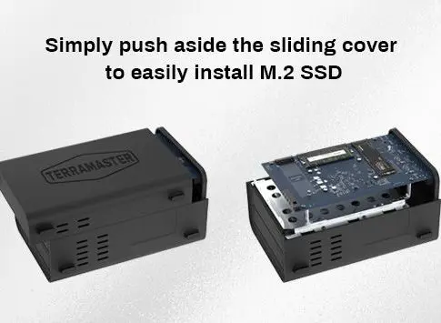 Para facilitar la instalación de unidades SSD M.2, TerraMaster ha concebido específicamente una cubierta lateral deslizante para el chasis F2-424: no hay más que apartarla para instalar las unidades SSD M.2. Además, TerraMaster proporciona tornillos que se aprietan a mano, para agilizar la instalación de una SSD en cuestión de 5 segundos.