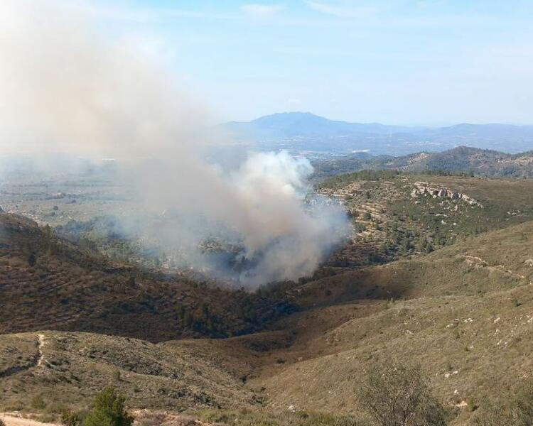 Los Bombers de la Generalitat trabajan este martes por la mañana en un incendio iniciado en el barranco del Racó de l'Ermita el Coll de l'Alba del municipio tarraconense de Tortosa.