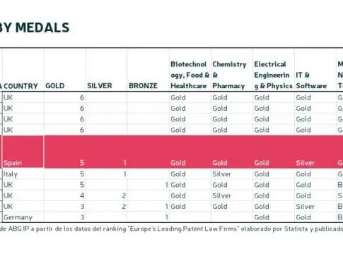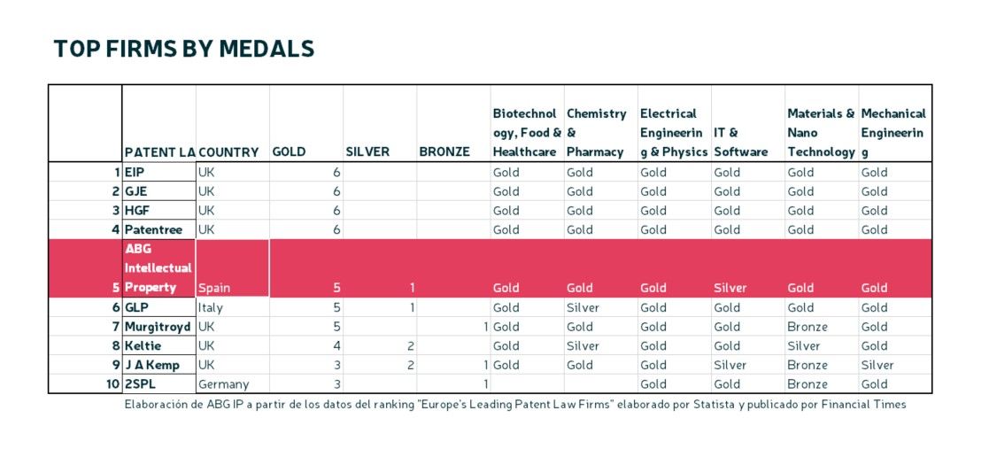Es el sexto año consecutivo en el que la empresa aparece en el listado, cuyos resultados se dividen en seis sectores innovadores en los que los despachos de patentes pueden obtener medallas de oro, plata o bronce. Tras una primera edición en 2019 en la que ABG IP fue la única firma española seleccionada, la compañía ha ido superándose en sus condecoraciones y este año ABG IP ha obtenido su mejor medallero con cinco oros (química y farmacia, biotecnología, física, ingeniería mecánica y nanotecnología) y una plata (tecnología informática).