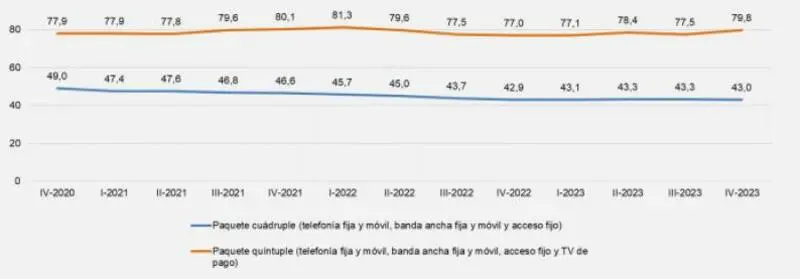 Por otro lado, los "paquetes cuádruples", que no incluyen la televisión de pago, han mantenido un precio estable, cerrando el 2023 con un valor medio de 43 euros, similar a los 42,9 euros registrados a finales de 2022.