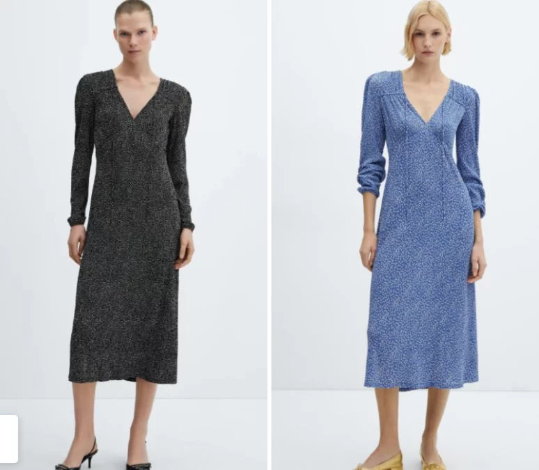 El tejido fluido del vestido estampado lazo de Mango es ligero y transpirable, perfecto para los días más calurosos del verano; además, su corte holgado te proporcionará comodidad y libertad de movimiento, disponible en color azul y negro.