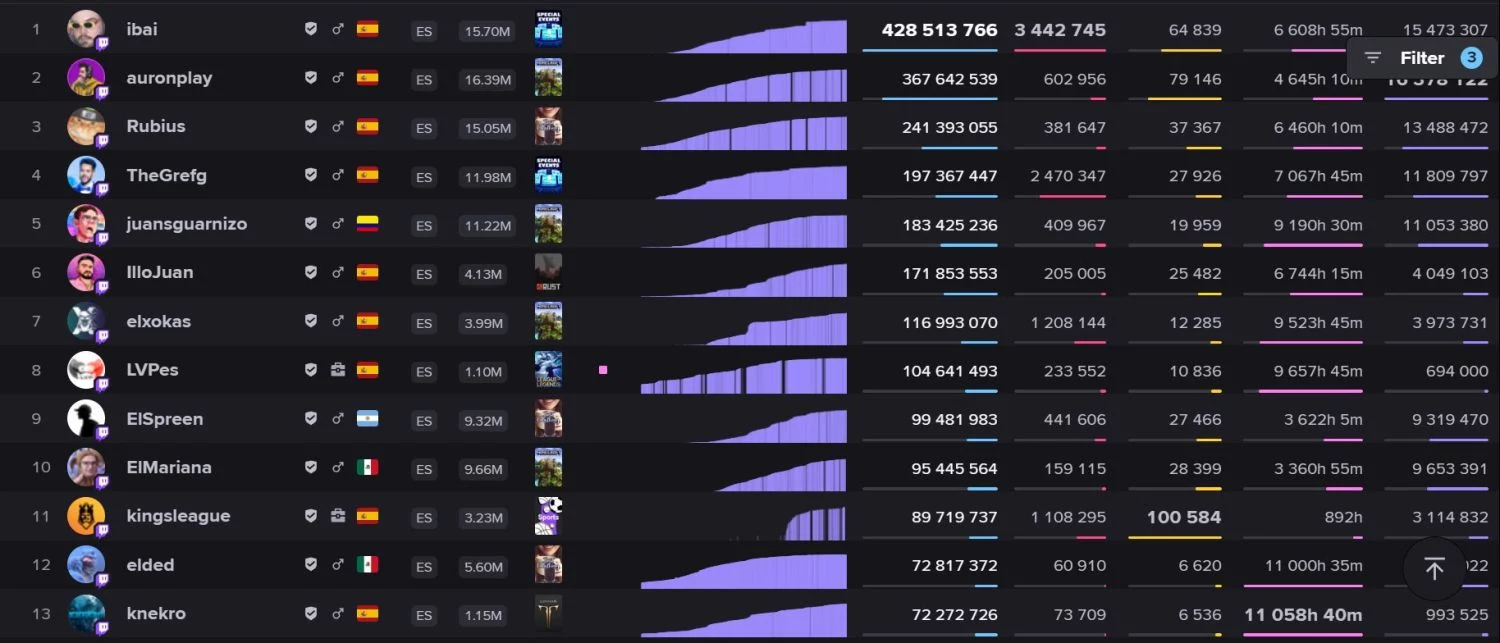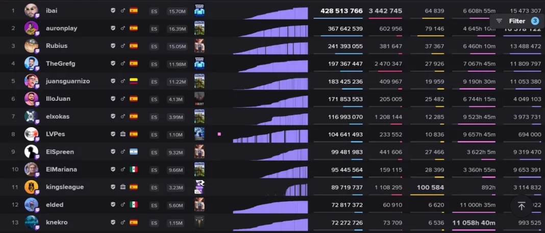 Además, muchos streamers están cerca de alcanzar los 50 millones de horas vistas, como Folagor (49M), ALKAPONE (48M), Alexelcapo (47M) y Reborn (45M), por lo que la lista podría ampliarse pronto.