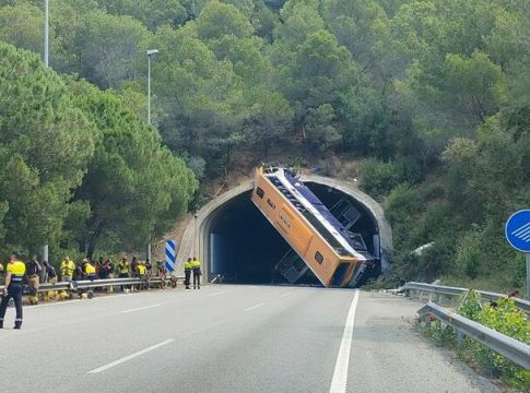El autobús quedó a 45 grados de elevación e impactó contra la entrada del túnel entre Pineda de Mar y Tordera (Barcelona), lo que obligó a mantener la carretera cerrada durante todo el día mientras se realizaban las labores de rescate y limpieza.