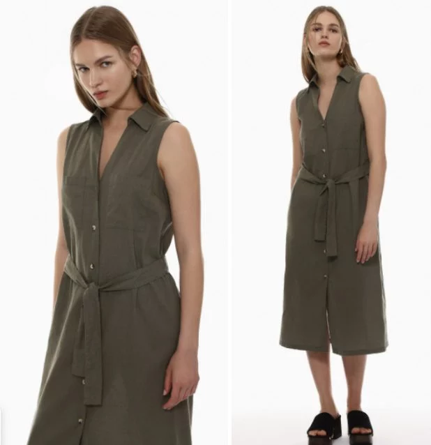 El diseño del vestido destaca por su cuello camisero, que le da un toque de sofisticación y elegancia; además, cuenta con bolsillos delanteros que le aportan funcionalidad y un aire casual, un detalle que no pasa desapercibido es el cinturón del mismo tejido que viene incluido con el vestido, el cual permite ajustar la prenda a la cintura y resaltar la silueta.