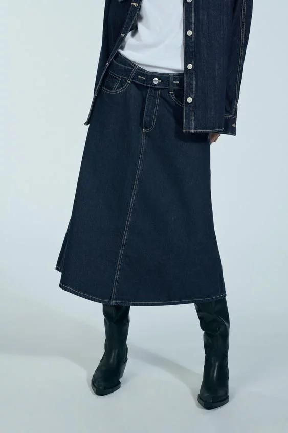 Zara ofrece la falda denim TRF vuelo por 29,95 EUR, una opción elegante y versátil para tu guardarropa. Esta falda midi de tiro medio destaca por sus cinco bolsillos funcionales y su cinturón del mismo tejido, que realza la cintura y proporciona un ajuste personalizado. Las costuras a contraste añaden un detalle distintivo, mientras que el cierre frontal con cremallera y botón metálico asegura una funcionalidad práctica y un acabado pulido.