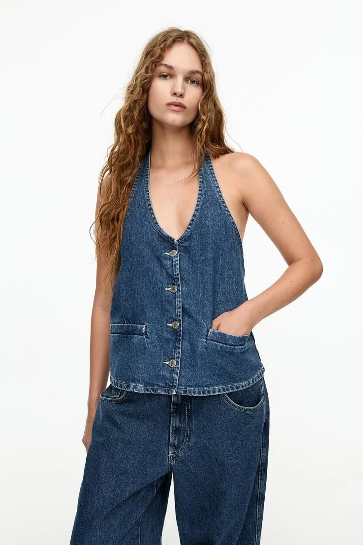 El top estilo chaleco de Pull&Bear es una prenda imprescindible para esta temporada. Confeccionado en tejido vaquero 100% algodón, destaca por su escote halter y su espalda descubierta, lo que le otorga un aire fresco y moderno, perfecto para los días calurosos de verano. Su diseño versátil permite combinarlo fácilmente con otras piezas de tu armario, desde shorts hasta faldas o pantalones de tiro alto, logrando looks casuales o más sofisticados según la ocasión.