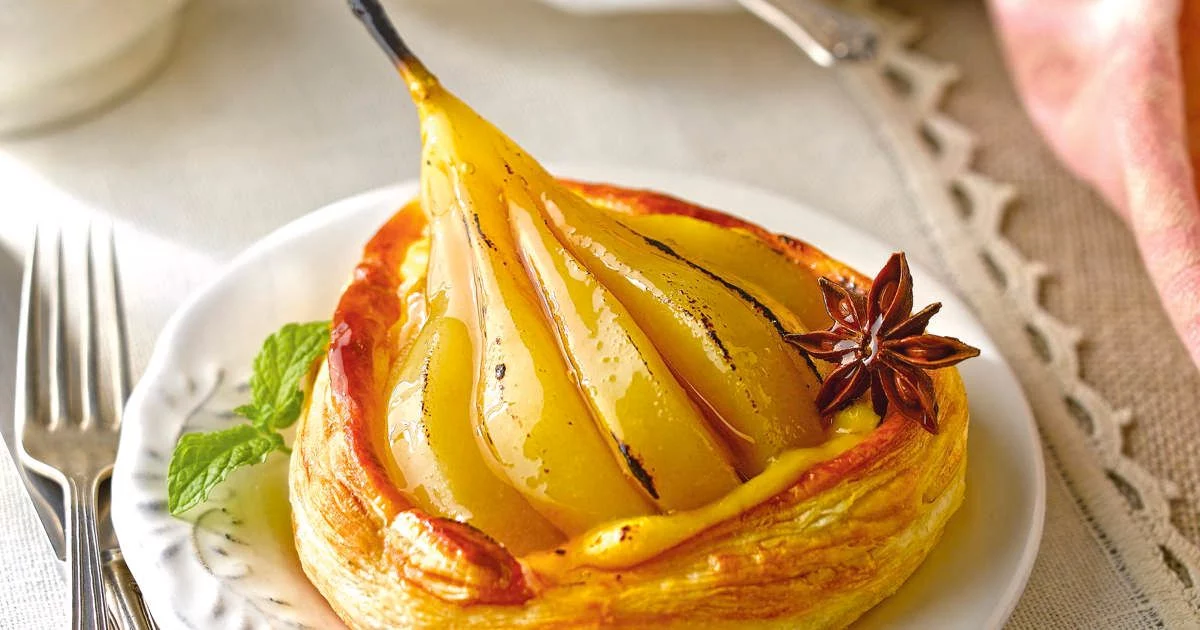 1Tartaleta de hojaldre con compota de pera y castañas asadas, uno de los postres propios del otoño