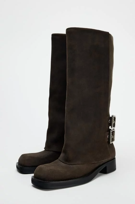 La bota de serraje con polaina y hebillas de Zara, disponible por 109,00 EUR, combina elegancia y estilo en una sola prenda. Confeccionada en serraje de alta calidad, esta bota presenta un diseño sofisticado con una doble tira con hebillas en la parte trasera, añadiendo un toque distintivo y moderno. El acabado en punta cuadrada proporciona un aire contemporáneo, mientras que la altura de la suela de 2 cm asegura comodidad durante todo el día.