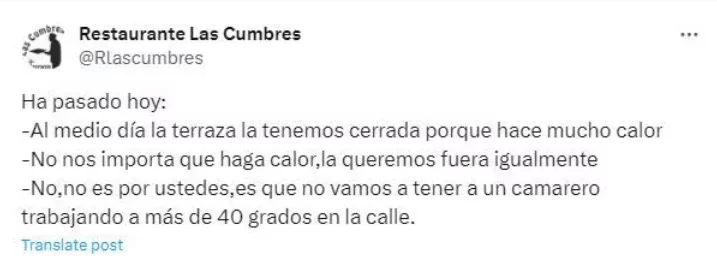 Los clientes, ofuscados por la situación, dijeron: "no nos importa que haga calor, queremos la mesa afuera igualmente". Lo que vino después fue la respuesta, que generó una ola de aplausos y felicitaciones por redes sociales. Esta fue: "La decisión no es por ustedes, es que no vamos a tener a un camarero trabajando a más de 40 grados en la calle".