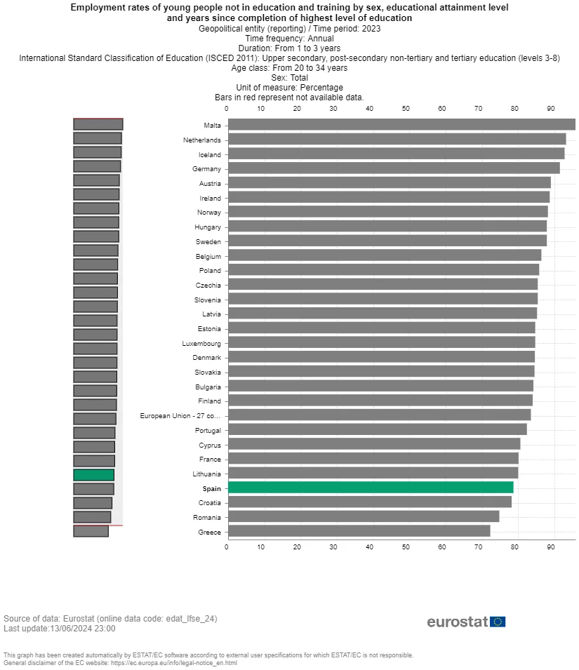 De todos modos, la gran preocupación es el empleo profesional. Tan importante para la estabilidad económica de un país como puede ser el empleo de los graduados. Solo una muestra, según datos de Eurostat, compartidos el día de ayer, España es el cuarto país dentro de la UE en el que es más difícil conseguir empleo para los profesionales recién salidos de la universidad, solo lo consigue el 78,7%. El mal dato es superado solo por Croacia (78,2%), Rumanía (74,8%), Grecia (72,3%), Italia (67,5%). Dentro de Europa pero fuera de la UE solo hay dos países más que superan el mal dato español, Bosnia y Herzegovina (57,8%) y la Turquía de Erdogan (64,7%).