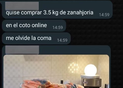 En los mensajes, se ve que el amigo dice que quería comprar 3,5 kilos de zanahoria en Coto online, una tienda de supermercados muy popular en Argentina. Sin embargo, su error fue que olvidó escribir la coma que va entre el 3 y el 5 especificando la cantidad.