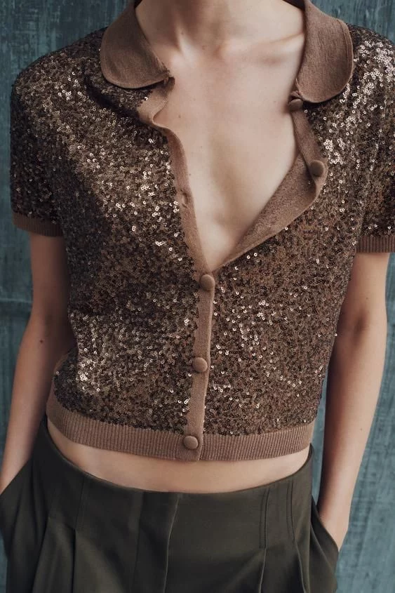 Añade un toque de sofisticación a tu vestuario con este polo de punto de Zara, disponible por 35,95 EUR. Este diseño elegante presenta un cuello bobo y manga corta, realzado con un detalle de lentejuelas que aporta un brillo sutil y encantador. Los acabados en rib a tono y el cierre frontal con botones completan el look con un aire refinado y moderno.