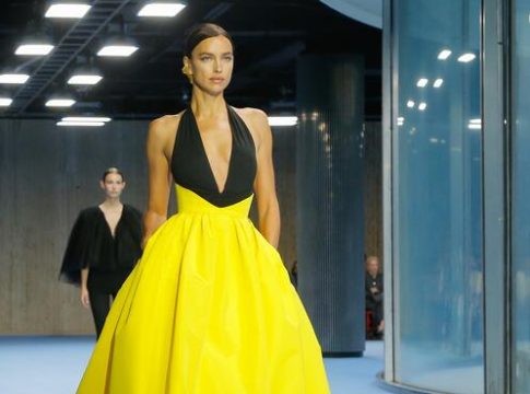 El momento culminante del desfile llegó con la aparición de la modelo Irina Shayk, quien lució un impresionante vestido de fiesta de escote pronunciado palabra de honor y falda estilo princesa en colores amarillo y negro, un ejemplo sublime del glamour que destila la colección Primavera-Verano 2025 de Carolina Herrera.