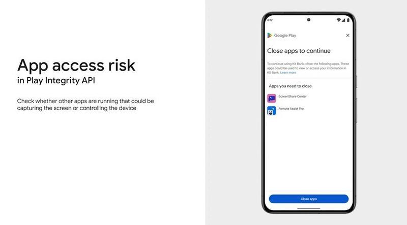 La nueva función de "Riesgo de Acceso de Apps" es la estrella de esta actualización. Gracias a ella, las aplicaciones podrán verificar si se están ejecutando otras apps que podrían capturar la pantalla o controlar el dispositivo, tal y como explica la compañía en el blog de Desarrolladores de Android. De esta forma, si el usuario tiene varias aplicaciones abiertas en su móvil, incluida la del desarrollador que ha habilitado esta función, verá una notificación en la que se le exige cerrar las que muestran un comportamiento de riesgo.