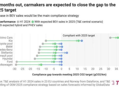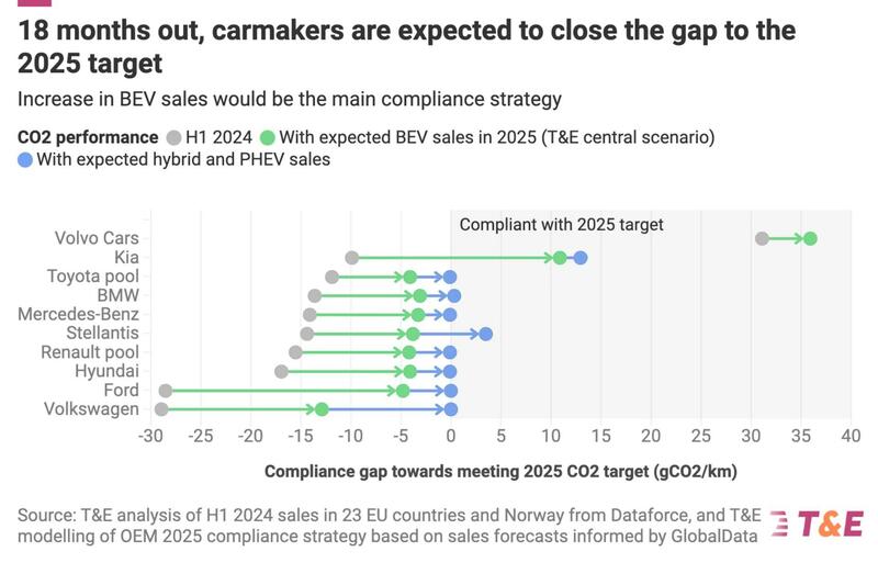 T&E señala que, al igual que con los objetivos de CO2 de automóviles anteriores, se espera que los fabricantes de vehículos europeos cierren su brecha de cumplimiento en el año objetivo, en lugar de antes de tiempo. Algunos líderes en ventas de vehículos eléctricos, como Volvo Cars, ya han alcanzado su objetivo de 2025, mientras que Volkswagen y Ford son los más rezagados y pueden considerar la formación de grupos de cumplimiento con los líderes para reducir la brecha.