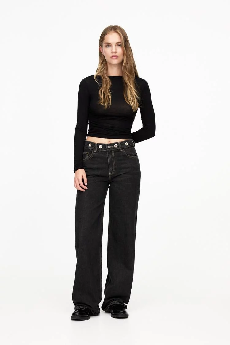 Los jeans wide leg ojales de Pull&Bear, disponibles por 35,99 €, combinan estilo y funcionalidad con un toque distintivo. En un elegante gris vigoré, estos jeans presentan un diseño de wide leg que ofrece un ajuste relajado y moderno. La cintura con ojales añade un detalle llamativo, mientras que el diseño de cinco bolsillos y el cierre de cremallera y botón aseguran tanto practicidad como un acabado pulido.