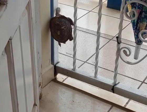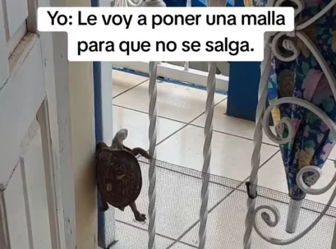 Alexa, la dueña del reptil, instaló la barrera creyendo que sería suficiente para mantenerla dentro. No obstante, la tortuga demostró tener más ingenio de lo esperado. En la sorprendente publicación se puede observar cómo usa sus patas traseras para impulsarse, escalando la malla y finalmente logrando cruzar la puerta con un salto impensado para muchos que piensan que esta especie es lenta y de poca movilidad.