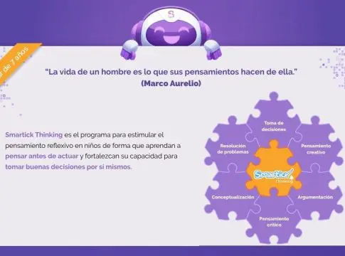 Thinking entrena las habilidades que conforman el pensamiento crítico de niños de 7 a 14 años. Con Smartick Thinking los niños aprenden, de una manera entretenida, a razonar con argumentos sólidos, a saber detectar falacias y sesgos, a distinguir información relevante de la que no lo es para resolución de problemas y, en definitiva, los prepara para tener criterio propio y que sean menos manipulables. Al igual que los otros programas de Smartick, en Thinking el contenido se va adaptando a las respuestas de cada niño en sesiones online de 15 minutos al día.
