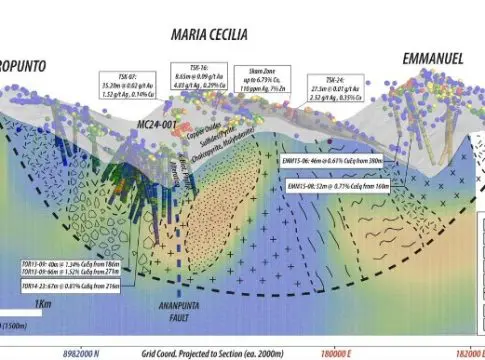 - Los sondeos confirman la zonación mineral de un sistema de pórfidos en María Cecilia situado en el centro de un sistema mineralizado de 5 km que abarca desde los recursos epitermales de alta sulfuración de cobre-molibdeno-oro de Toropunto de Camino hasta los recursos de pórfidos de cobre-molibdeno de Emmanuel de Camino.