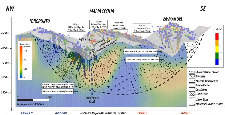 El primer sondeo de exploración en María Cecilia MC24-001 está situado en una zona de afloramiento de óxidos de cobre con leyes de hasta 0,7% Cu. El sondeo se orientó hacia el borde NO de la anomalía magnética geofísica, Pórfido 1, alcanzando una profundidad total de 696 metros, incluyendo continuidad anómala de cobre a más de 234 m de la superficie con leyes de 0,08% Cu principalmente en vetillas con calcopirita y diseminadas después de los primeros 40 m de perforación. La perforación en superficie interceptó inicialmente óxidos de cobre negro (tenorita).