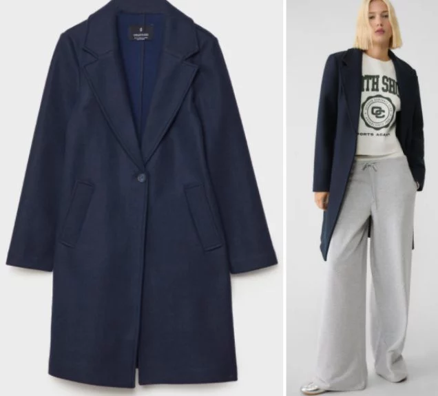 1El abrigo midi punto de Stradivarius azul marino: Elegancia y comodidad