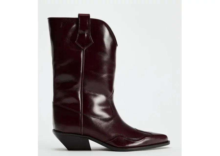 La bota cowboy en burdeos no solo sigue el estilo del viejo oeste, sino que incorpora un aire sofisticado y único, gracias a su tono vibrante pero sobrio. Es ideal para combinar con vestidos de tejidos ligeros en tonos neutros, o incluso con pantalones oscuros para darle un toque de contraste. Con esta opción, Zara demuestra que sabe cómo reinventar el clásico estilo cowboy y adaptarlo a las tendencias actuales.