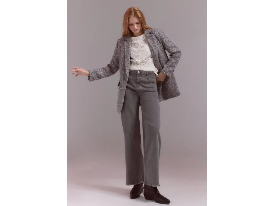 Este modelo incluye trabillas para el cinturón y bolsillos rectangulares que añaden un toque distintivo. Su tono gris neutro los hace increíblemente versátiles, ideales para combinar con camisas en tonos pastel o jerséis de punto grueso.