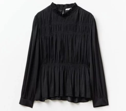 La blusa fluida con frunces de Sfera se adapta a diferentes estilos y ocasiones. Aquí algunas sugerencias para incorporarla en tu guardarropa: