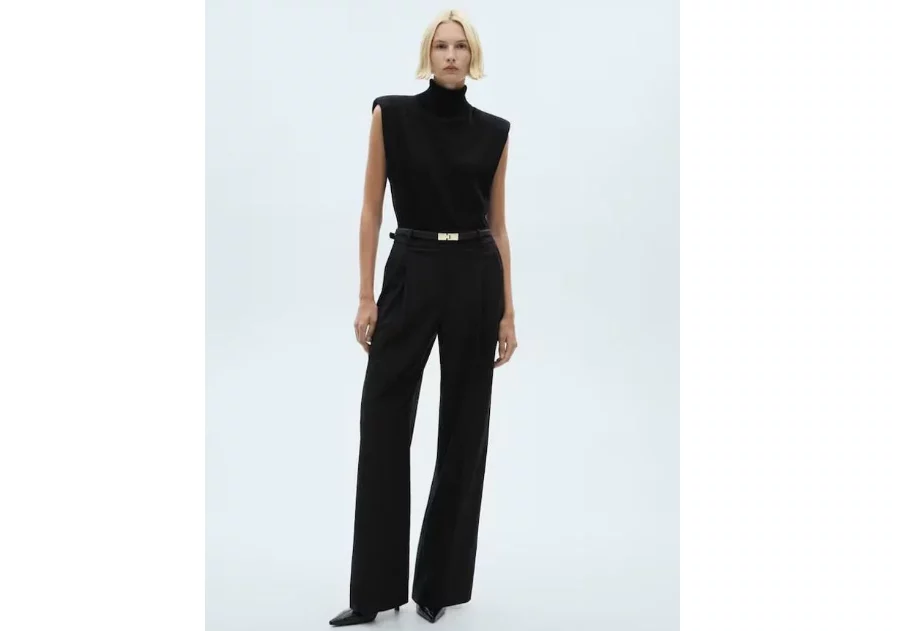 El diseño cuenta con mangas sisa y hombreras que estructuran los hombros, mientras que su cuello alto aporta un aire refinado. El cinturón fino efecto piel con acabado dorado no solo define la cintura, sino que también le añade un toque de lujo. Las perneras anchas con detalle de pinzas completan un look que puedes llevar con botines de tacón para un acabado impecable.