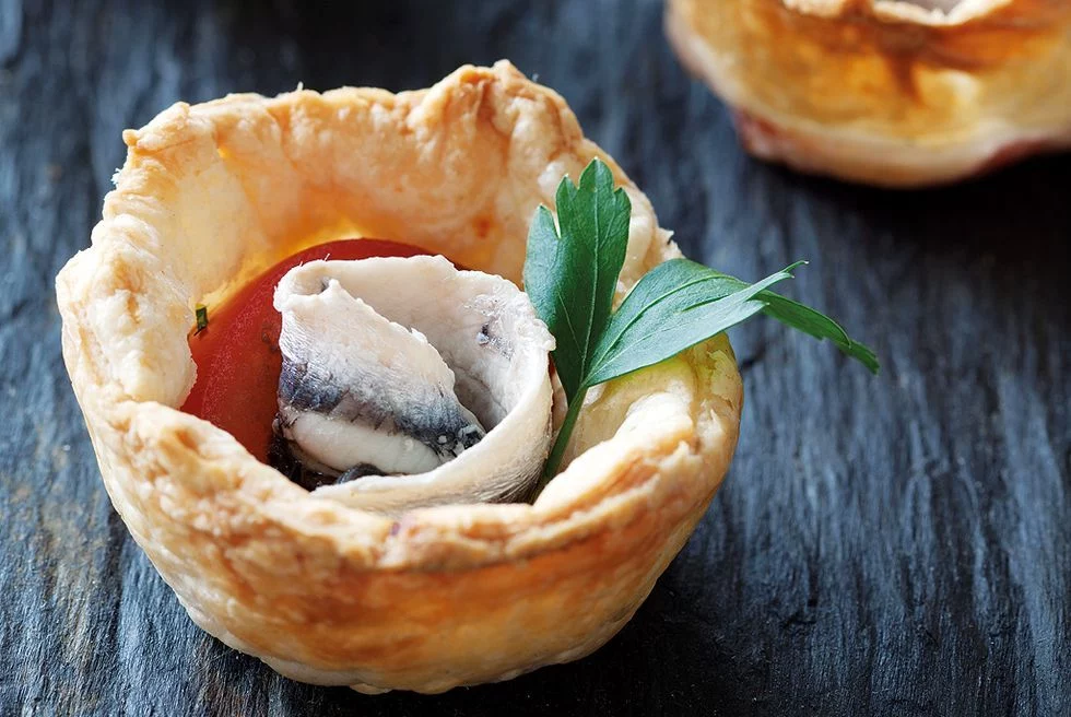 - Una vez horneadas las tartaletas, cubre con la pasta de aceitunas y pon los boquerones sobre ellas.