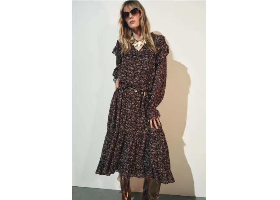 Empezamos con uno de mis favoritos: el vestido de estilo boho de Zara. Si eres de las que adoran esa estética desenfadada pero sofisticada, este vestido te va a encantar. Tiene un diseño bohemio muy marcado, con estampados étnicos y colores tierra que lo hacen perfecto para los días fríos. Imagina combinarlo con unas botas altas y un abrigo de lana. ¡Ideal para estrenar el año con estilo!