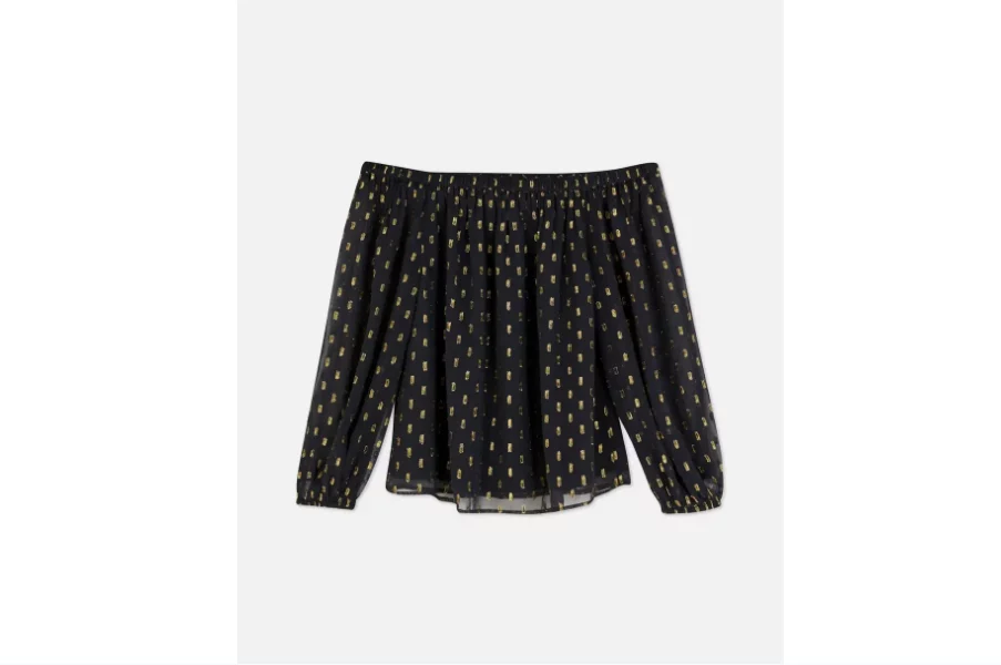 El escote bardot sigue siendo tendencia, y esta blusa de Primark lo reinventa con un diseño suave y delicado. Su tejido incluye detalles de plumeti dorado que añaden un toque elegante y femenino.