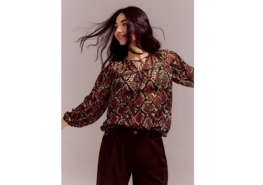 El animal print sigue siendo tendencia, y esta blusa granate es prueba de ello. Con un detalle de cordón fruncido en el canesú y manga, así como un escote con cordón y puños elásticos, es ideal para quienes buscan algo único.