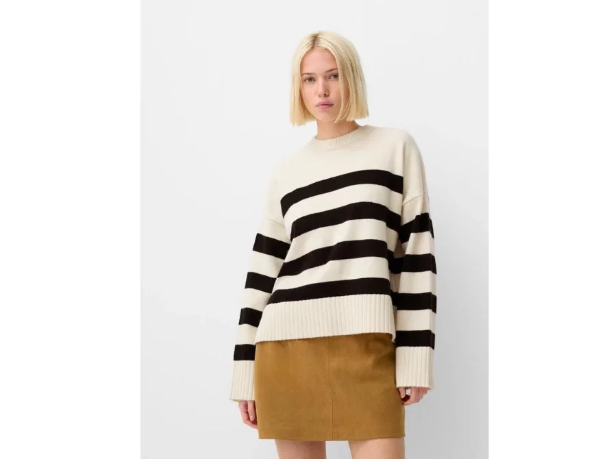 El jersey de rayas blanco y negro de Bershka, por 25,99 euros, es la definición de elegancia sencilla. Su diseño oversize y cuello redondo lo convierten en un básico que siempre está de moda. Es una prenda que puedes usar una y otra vez sin cansarte.