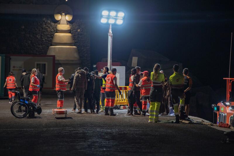 El primer cayuco llegó en la noche de este lunes -tras una jornada con cinco cayucos y más de 350 personas rescatadas- al puerto de La Restinga, en El Hierro, acompañada por la Salvamar Adhara, con 143 personas a bordo, 47 de ellas mujeres y 22 menores.