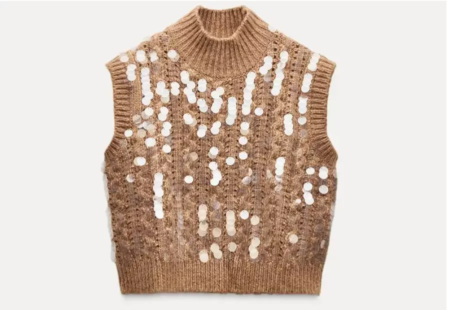 El jersey tipo chaleco con lentejuelas es otra de las estrellas de las rebajas de Zara. En el color Mocha Mousse, una tonalidad tendencia en 2025, este chaleco es perfecto para darle un toque moderno y sofisticado a tu outfit. Disponible solo en talla M, está rebajado a 19,99 € (antes 29,95 €), REF: 3020/175/732.