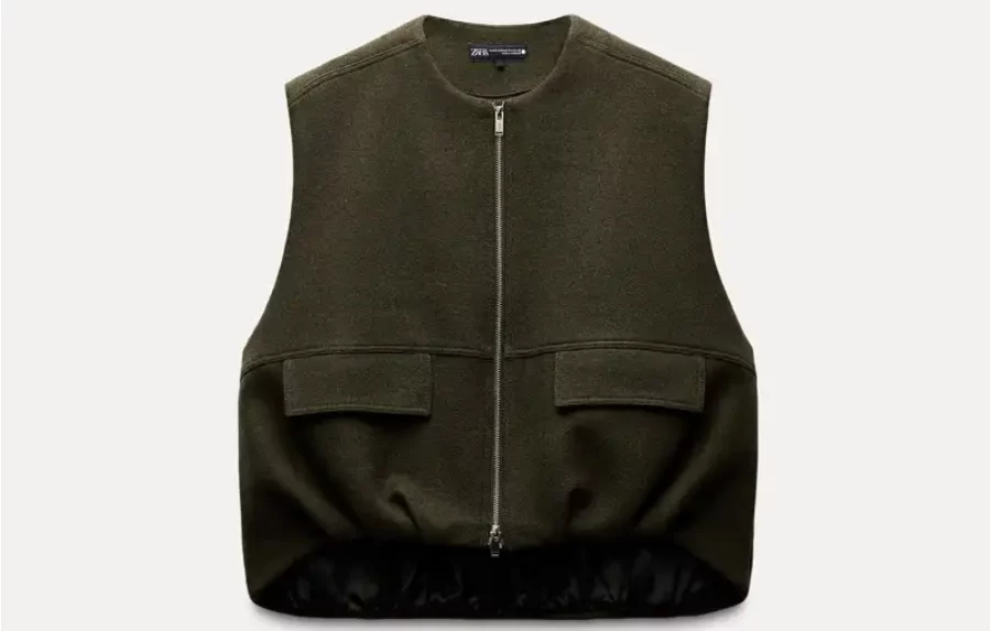 El chaleco oversize en mezcla de lana y color verde oliva es una de las prendas más deseadas de esta temporada. Rebajado a 39,99 € (antes 69,95 €), solo está disponible en tallas M y L, REF: 9321/746/505.