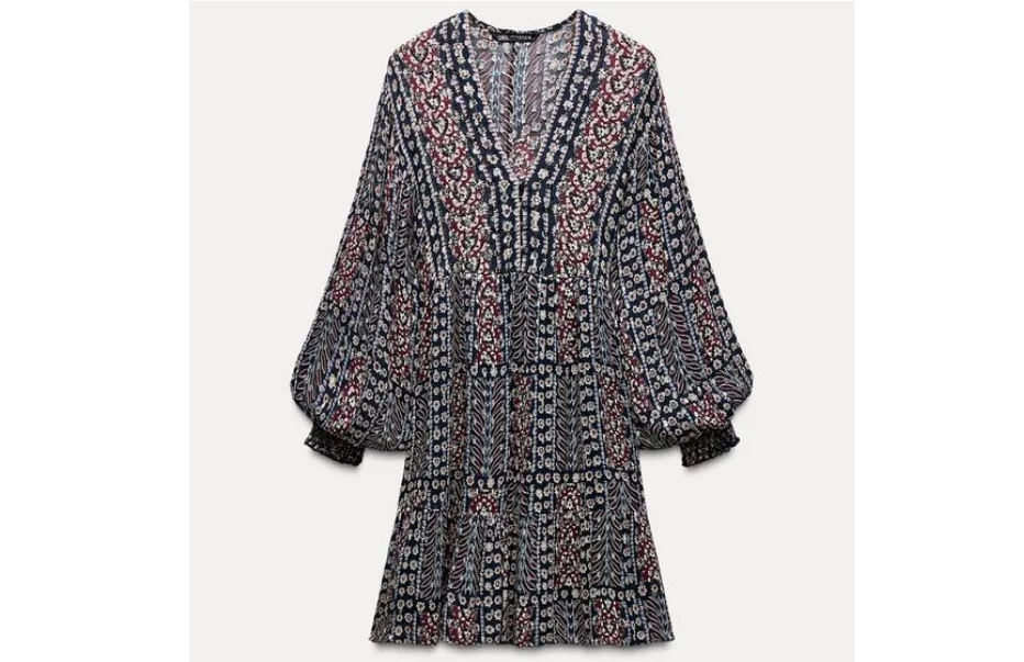El diseño de este vestido que encuentras en Zara, destaca gracias a su originalidad y detalles delicados. Su tejido combina de manera majestuosa los tonos tierra con el brillo de los hilos metálicos, lo que da a la prenda un aire étnico, ciertamente, pero con una gracia moderna que a todos enamora.
