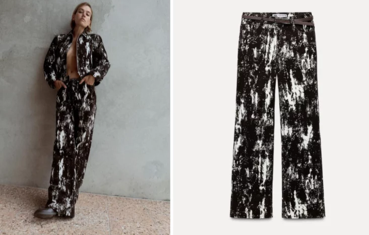 Si deseas unos jeans que no pasen desapercibidos y que queden espectacular con zapatillas, los jeans flocados estampado animal de Zara cumplen con los requisitos, ya que son muy atrevidos y vistosos. Estos jeans de tiro alto cuentan con un cinturón incorporado y cinco bolsillos funcionales, esto lo convierte en una prenda práctica y versátil. El estampado de tejido flocado con estampado animal imprime un carácter único y audaz, perfecto para quienes quieren destacar.