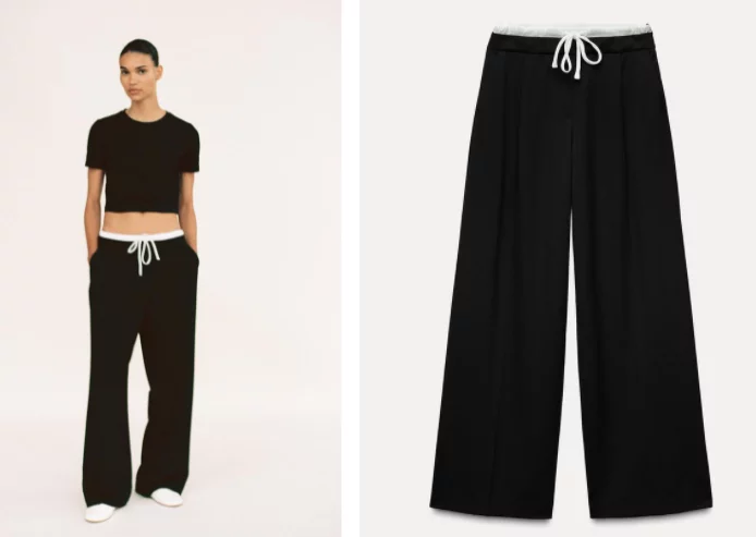 Zara trae una nueva propuesta con el pantalón ancho cintura doble que combina la comodidad de un pantalón deportivo, pero con mucho estilo; Esta prenda con un diseño de tiro alto cuenta con una doble cintura elástica ajustable con cordón, muy sencillo pero cómodo y adaptable a todo tipo de cuerpos. Posee la pernera ancha, lo que hace la ilusión de una silueta moderna y relajada, perfecta para looks casuales pero con estilo.