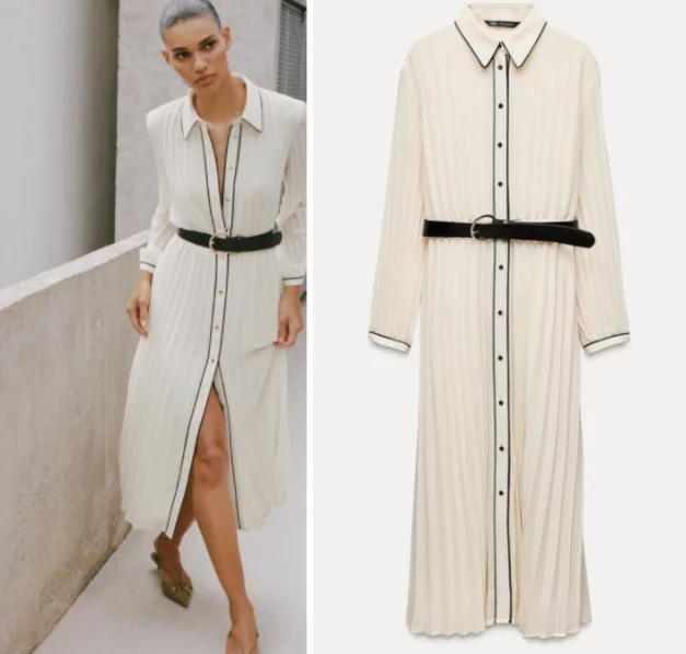 El vestido midi plisado con cinturón es una apuesta de Zara para crear tendencia en esta primavera, con un diseño elegante y sofisticado, su cuello de solapa y manga larga, posee la cintura elástica muy favorecedora para definir la silueta, además, tiene un cinturón para ajustar según el tipo de cuerpo.